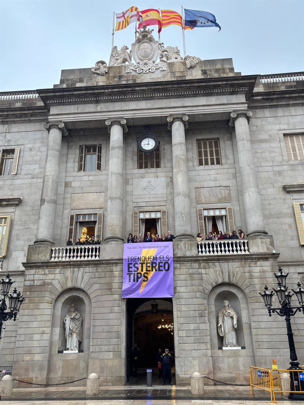 El Ayuntamiento de Barcelona despliega una lona por el 8M en su fachada - EUROPA PRESS