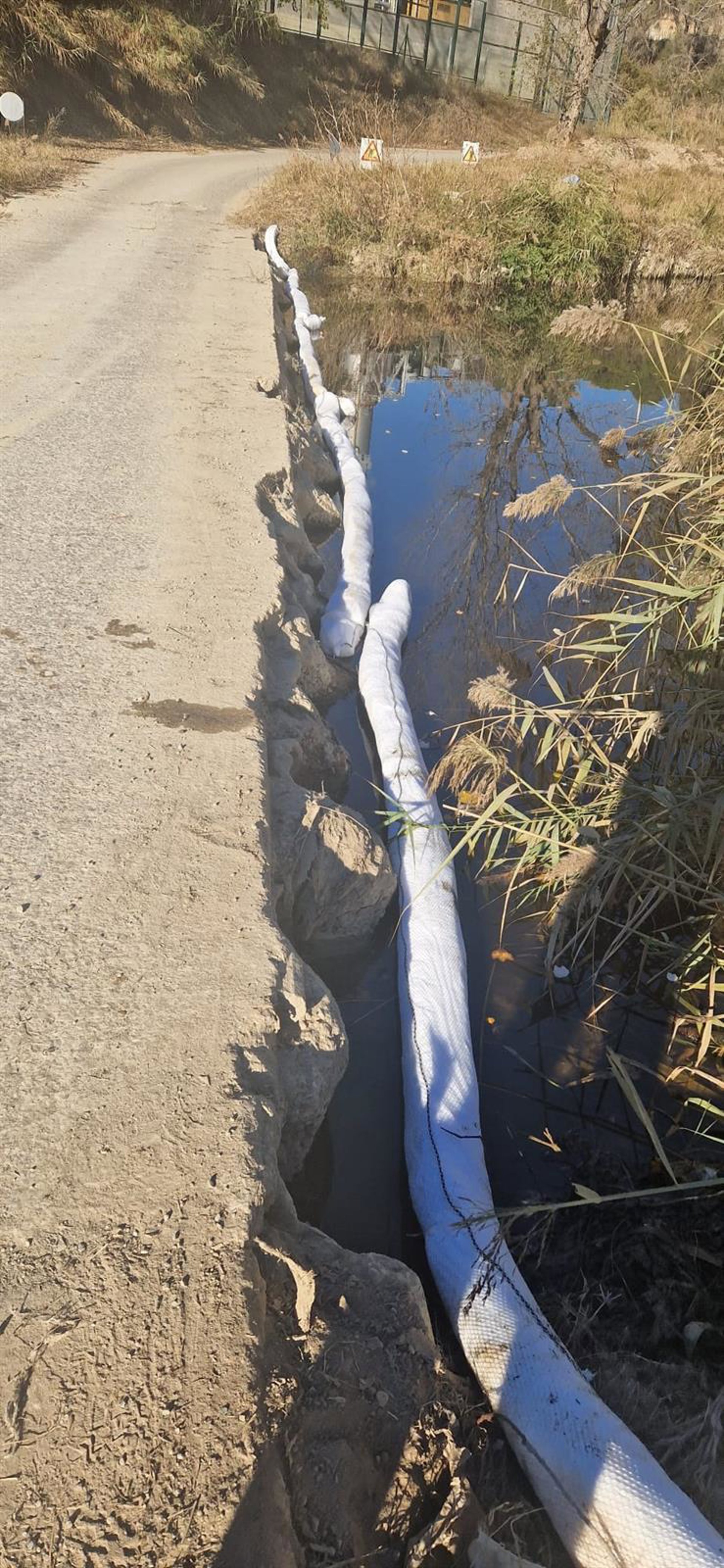 La ACA coloca barreras flotantes en el río Anoia a la altura de la Pobla de Claramunt (Barcelona) para contener los restos de los 20.000 litros de gasoil que se han vertido a causa del robo de una tubería de cobre - @AIGUA_CAT