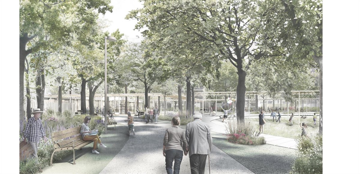El nuevo espacio contará con una zona de juegos infantiles y otra de salud y gente mayor, una plaza central, huertos urbanos comunitarios, grandes parterres, un centenar de árboles y una gran pérgola donde más adelante se instalarán placas fotovoltaicas.
