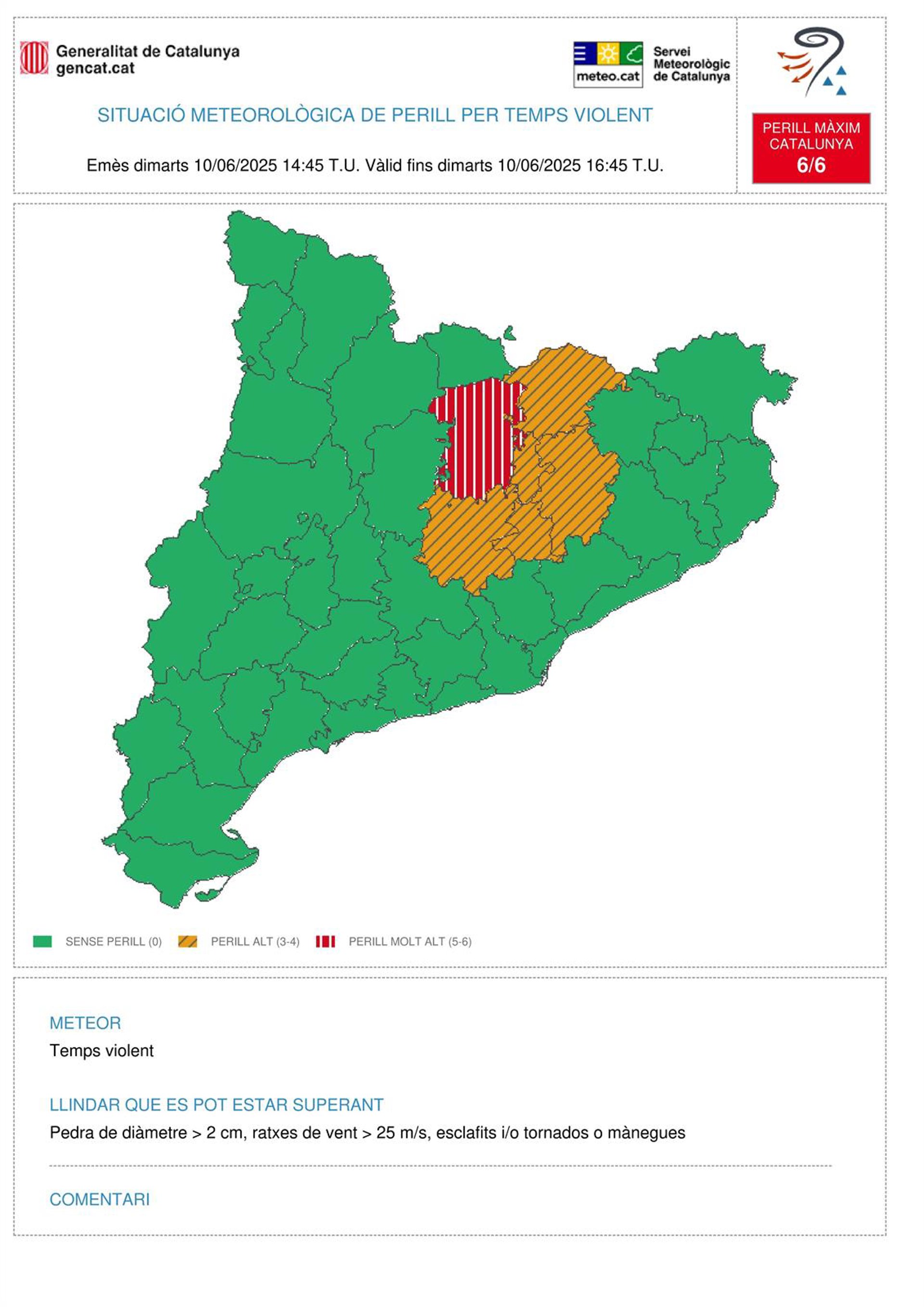 En las cinco primeras comarcas el riesgo es alto, mientras que en el Berguedà es "muy alto", y el aviso está activo de 16.45 a 18.45, informa en un apunte en 'X' recogido por Europa Press.