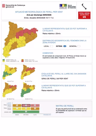 El viento se prevé en Catalunya en general, y este domingo se pueden superar los 100 km/hora, según informa el Meteocat vía X.