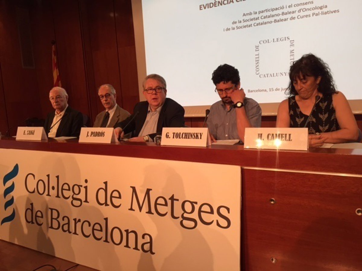 En rueda de prensa este jueves, el vicepresidente del Consell de Col·legis de Metges de Catalunya (CCMC) y presidente del COMB, Jaume Padrós, ha presentado el documento 'El enfermo con cáncer. Los tratamientos oncológicos y paliativos, las terapias sin evidencia científica y las pseudociencias', consensuado con la Sociedad Catalano-Balear de Oncología y la de Cuidados Paliativos, que define cómo deben actuar los profesionales y la información que les deben proporcionar.