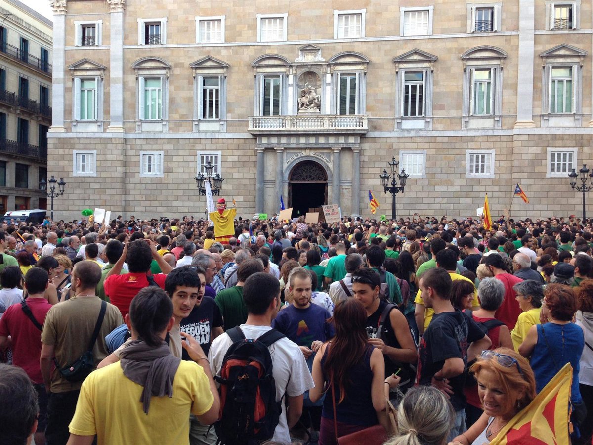 La concentración convocada este domingo en Barcelona en apoyo a la huelga indefinida de los profesores de Baleares para pedir la retirada completa del Tratamiento Integrado de Lenguas (TIL) ha llenado la plaza Sant Jaume.