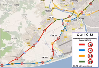 La Autovía de Castelldefels, la C-31, y la Autopista del Garraf, la C-32, que desde 2009 funcionan con el sistema de velocidad variable, pasarán a estar limitadas a 100 y 120 kilómetros por horas este lunes, tras más de dos años de zona 80.