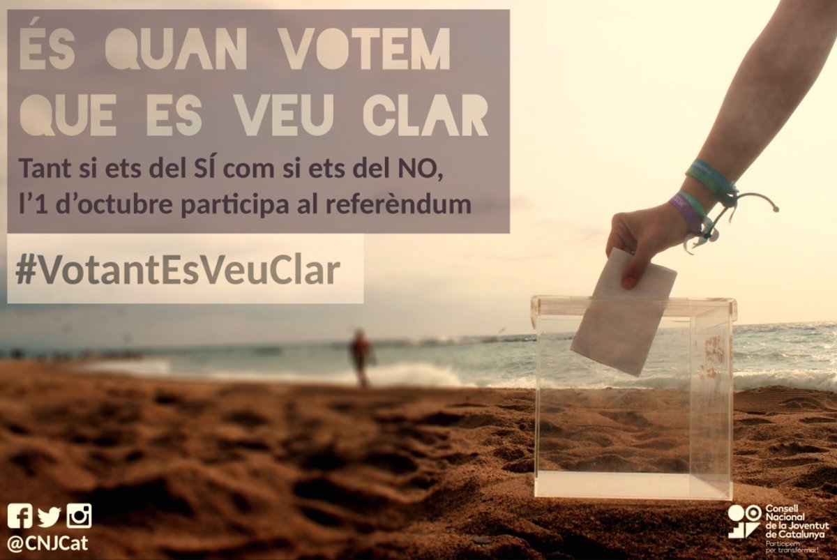 El Consell Nacional de la Joventut de Catalunya (CNJC), plataforma que agrupa a 88 asociaciones juveniles catalanas, ha puesto en marcha la campaña #VotantEsVeuClar, bajo el lema 'És quan votem que es veu clar' (Es cuando se vota que se ve claro), que anima a los jóvenes a votar en el referéndum convocado para el 1 de octubre.
