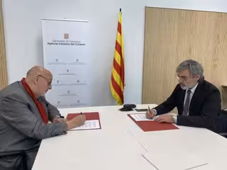 El director de la Agncia Catalana del Consum (ACC), Francesc Sutrias, y el presidente de PimeComer, lex Goñi, durante la firma del protocolo. - GENERALITAT DE CATALUNYA