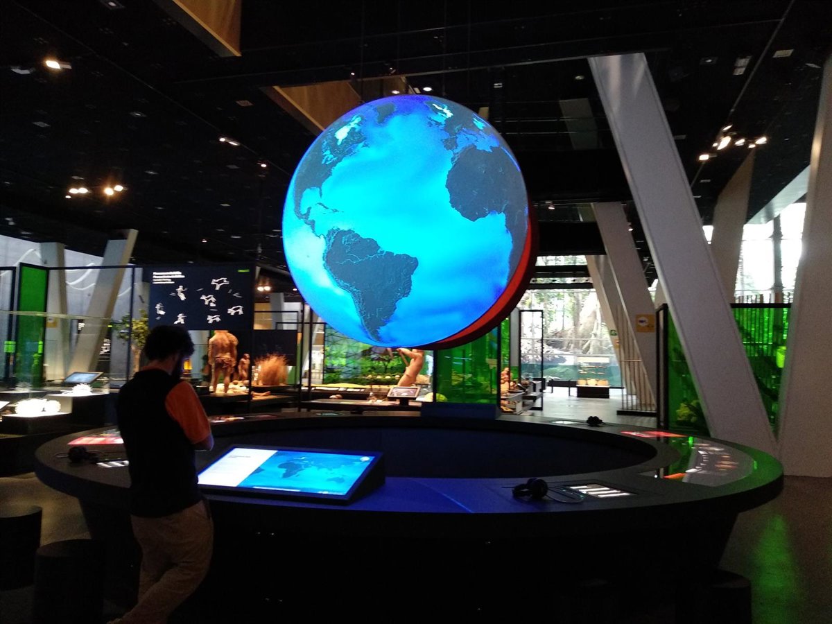 El globo terráqueo con audiovisuales -que es el segundo más grande del que tienen constancia-- muestra datos como las zonas en las que hay dengue, el tráfico aéreo, los usos agrícolas y, a la vez, "tiene una labor de concienciación con referencias medioambientales, y como especie humana" durante la evolución.