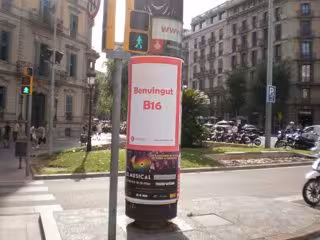 En una primera fase, que empezó este lunes y durará dos semanas, la asociación católica reparte los carteles de 100x140 centímetros por la ciudad, bajo el lema 'Bienvenido B16'.