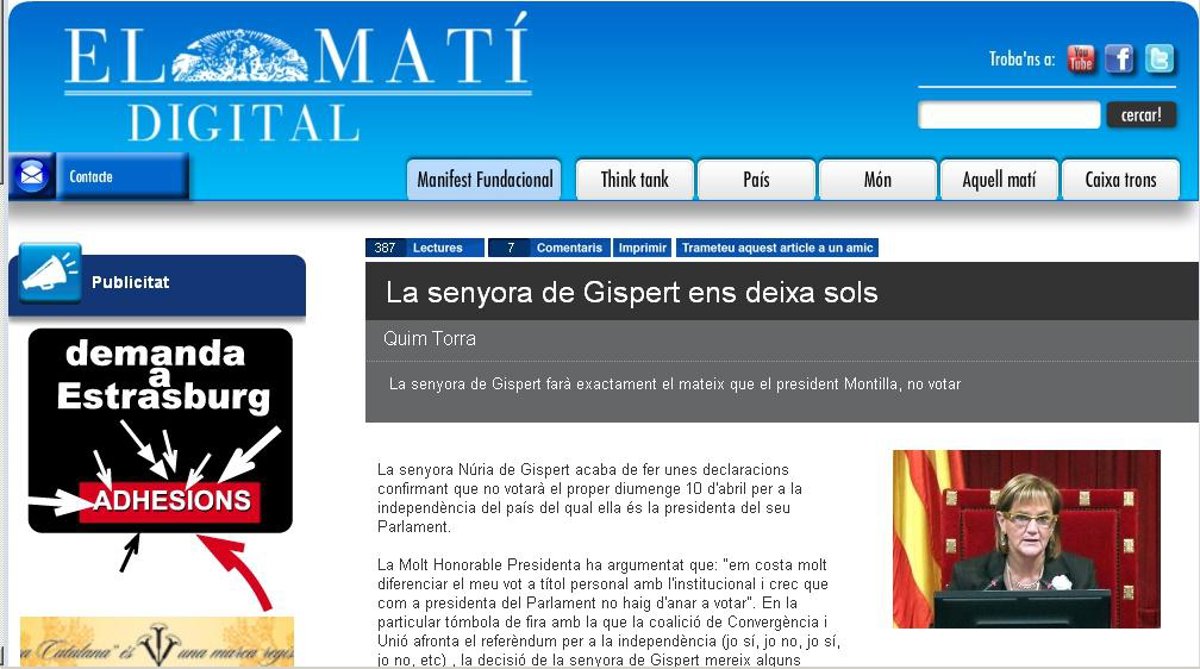 El representante del sector crítico de UDC El Matí, el editor Quim Torra, ha remarcado este lunes que la negativa de la presidenta del Parlament, Núria de Gispert, de participar en la consulta soberanista de Barcelona "degrada, empequeñece y desnacionaliza" la institución que representa.