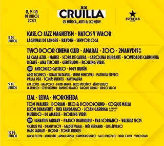 En el tercer y último día del festival actuará, entre otros, Izal, Leiva, Morcheeba, Tom Walker, Dorian, Iseo & Dodosound, Coque Malla y León Benavente y, además, el viernes y el sábado tendrá lugar el ciclo de comedia Crulla Comedy, que hará subir al escenario a Ignatius Farray, Antonio Castelo, Eva Soriano, Iggy Rubín, Valeria Ros, Charlie Pee, Danny Boy, Inés Hernand, Marc Sarrats, Modgi y Toms Fuentes, entre otros humoristas y cómicos.