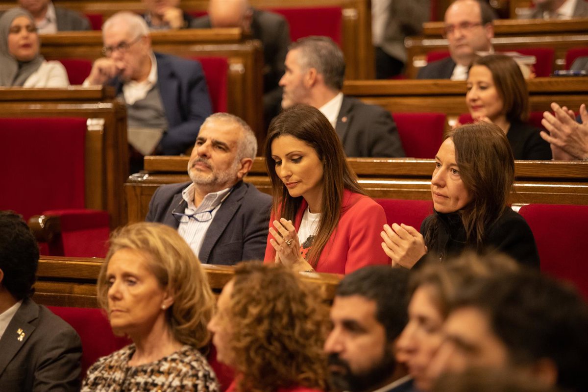 (I-D) Los diputados de Ciudadanos Carlos Carrizosa, Lorena Roldán y Marina Bravo aplauden durante un pleno extraordinario convocado tras la decisión de la Junta Electoral Central (JEC) de inhabilitar al president de la Generalitat, Quim Torra - Pau Venteo - Europa Press