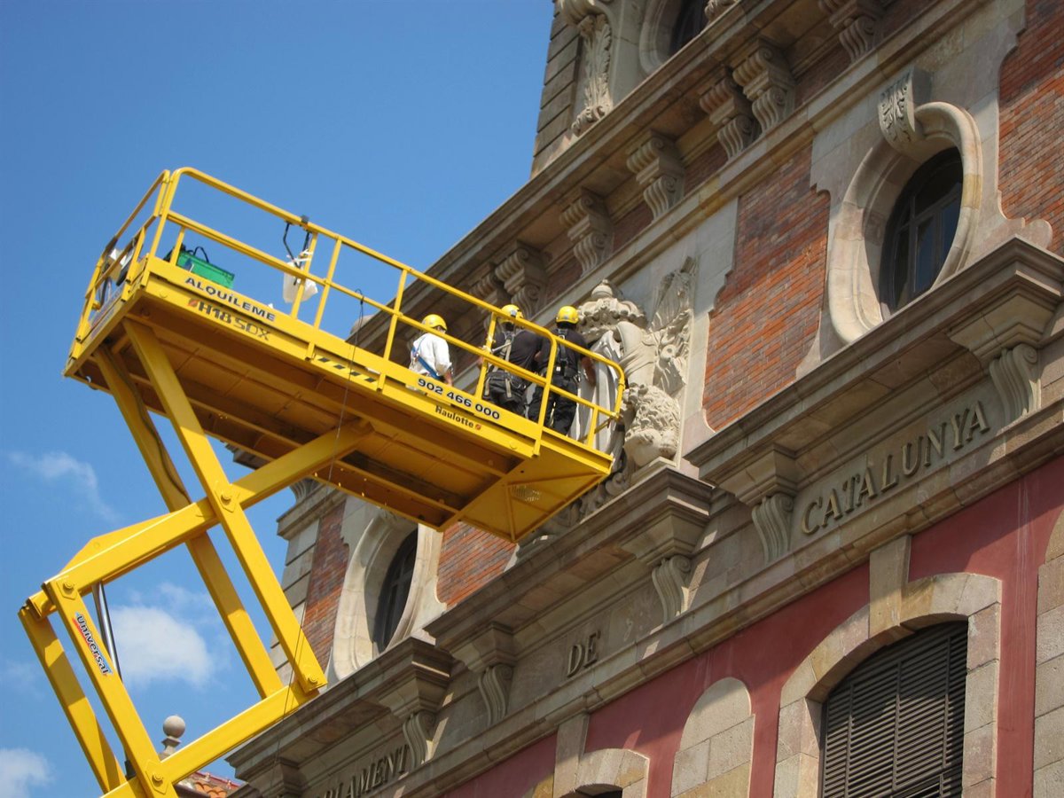 Aunque se inaugurará el lunes con motivo de la Diada del día siguiente, los operarios han colgado ya el nuevo escudo de piedra a mediodía de este jueves, y realizarán los últimos retoques hasta el sábado.