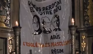 En la pancarta desplegada se podía leer: "Que os perdone vuestro Dios. La Iglesia es abuso, machismo y régimen", junto con dibujos de los rostros del abad de Montserrat, Josep Maria Soler, del arzobispo de Tarragona, Jaume Pujol, y del obispo de Girona, Francesc Pardo.