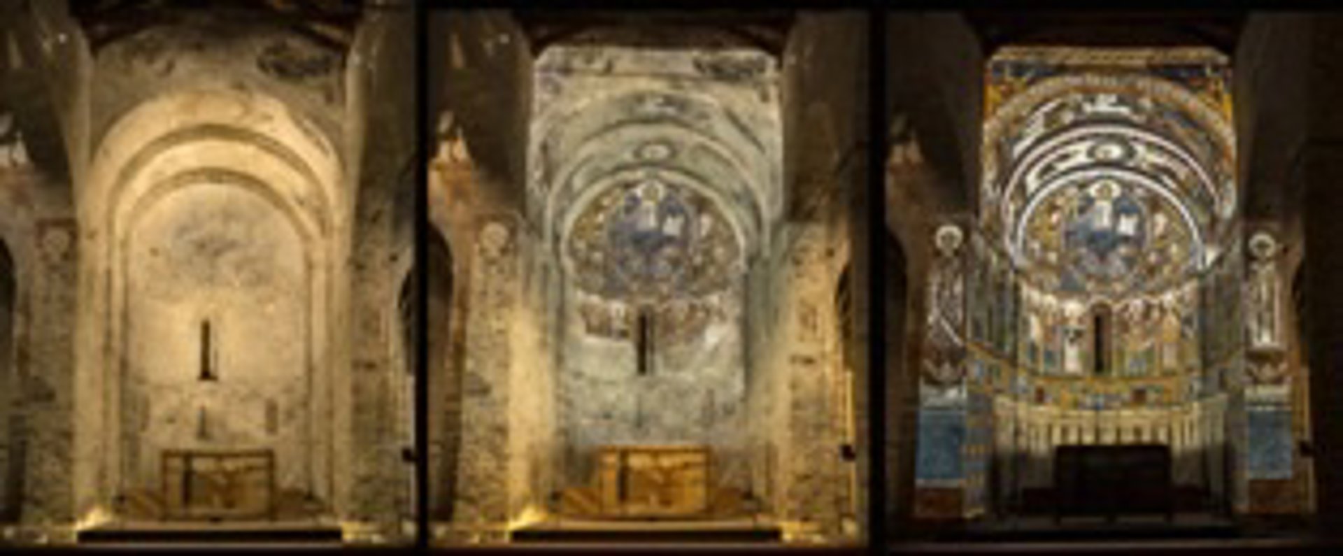 Estos vestigios hacían inviable situar de nuevo delante una copia física de la pintura ausente, por lo que los técnicos optaron por la proyección de la imagen original por el sistema mapping que permite reproducir al ábside y a escala real la pintura conservada en el MNAC, además de añadir con dibujo digital la reconstrucción de las partes perdidas, deducidas según el estudio de los vestigios.