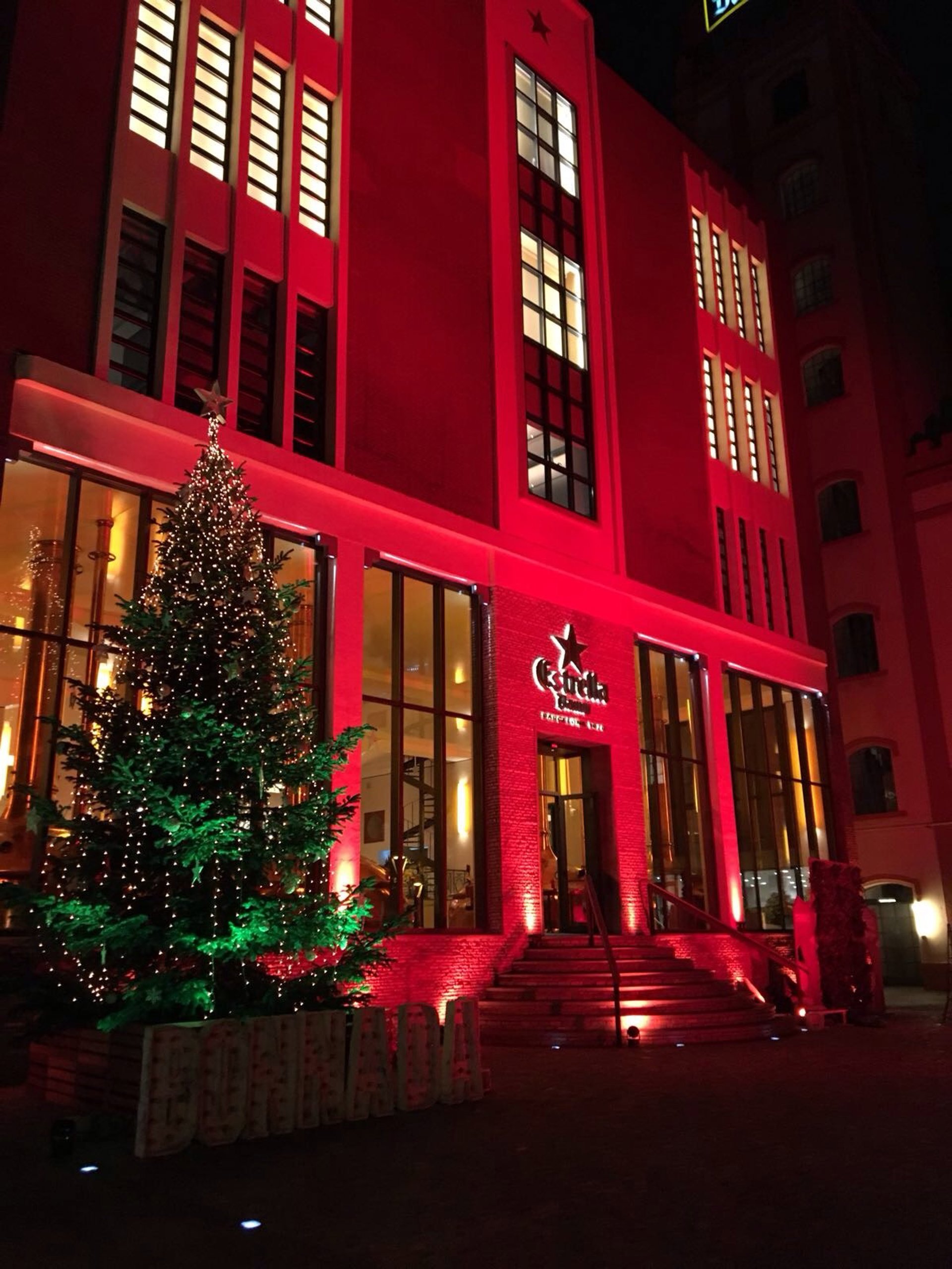 Fachada iluminada de la Antigua Fábrica Damm - DAMM