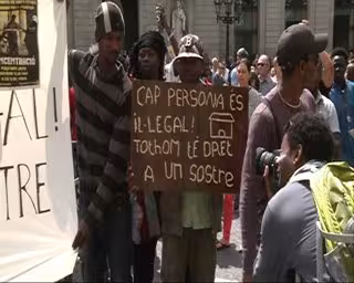 Decenas de personas, cincuenta según la Guàrdia Urbana, se han concentrado este domingo en la plaza Sant Jaume de Barcelona para exigir a la administración que no desaloje a los más de 300 inmigrantes que viven en dos naves industriales del barrio barcelonés de Poble Nou.