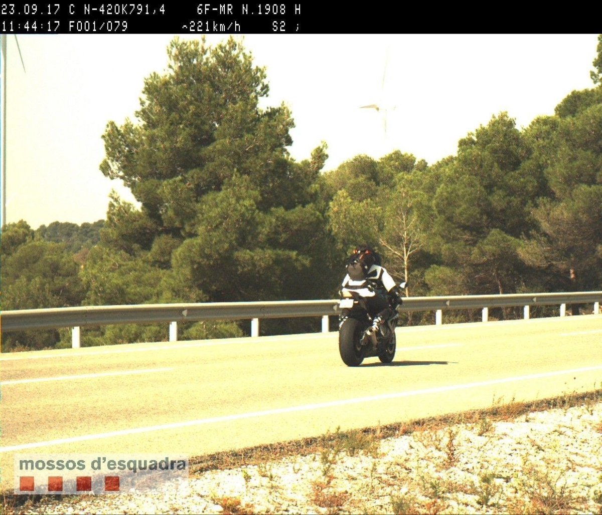 Los Mossos d'Esquadra han denunciado penalmente a un motorista de 27 años como presunto autor de un delito contra la seguridad viaria por circular a una velocidad superior a la permitida por la N-420 a la altura de Caseres (Tarragona), donde un control detectó que conducía a 221 kilómetros por hora.