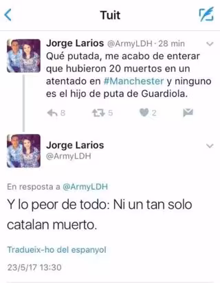 "Me acabo de enterar que hubieron 20 muertos en un atentado en Mánchester y ninguno es el hijo de puta de Guardiola", publicó el usuario el 23 de mayo.
