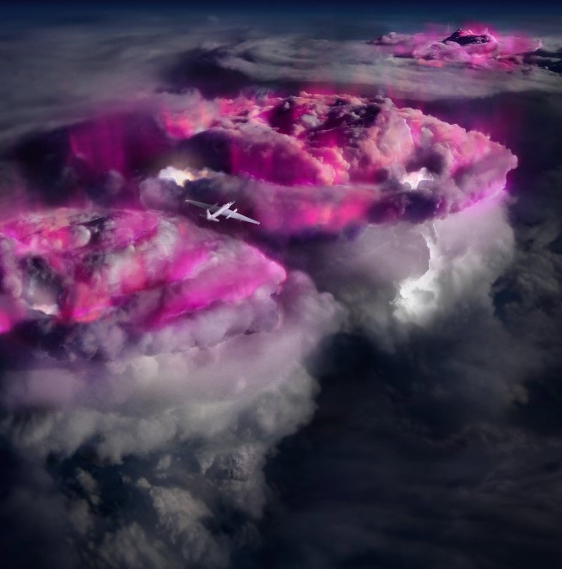 Recreación artística del avión de la NASA sobrevolando nubes brillantes de rayos gamma en el Caribe - UIB/MOUNT VISUAL