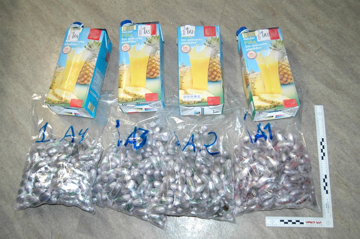 En el registro del vehículo, los agentes hallaron dos maletas con bolsas de plástico en su interior, donde hallaron los cartones de zumo que contenían paquetes plastificados con el hachís, y detuvieron al propietario de la maleta, de nacionalidad marroquí, como presunto autor de un delito contra la salud pública.