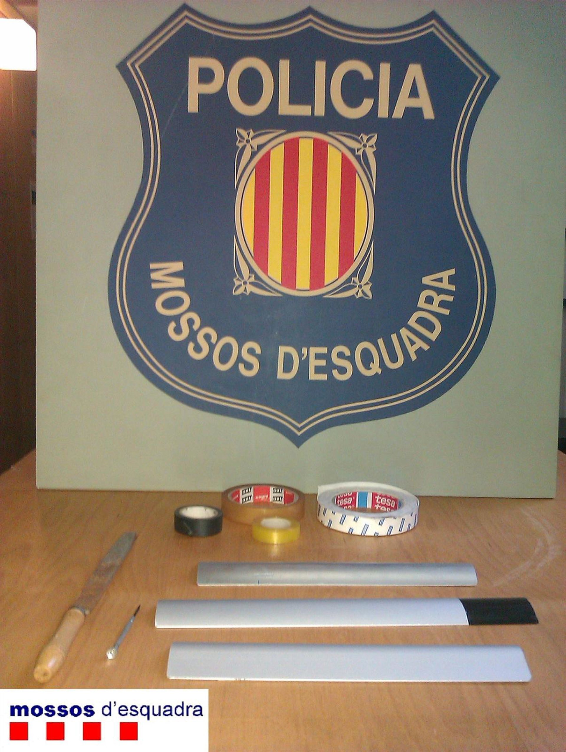 Los agentes hallaron en poder de los presuntos ladrones cuatro rollos de cinta adhesiva, una lima, un destornillador de pequeñas dimensiones y dos tapas plateadas de 25 centímetros de longitud, y comprobaron que las manipulaciones de los cajeros habían provocado daños en dos de ellos.
