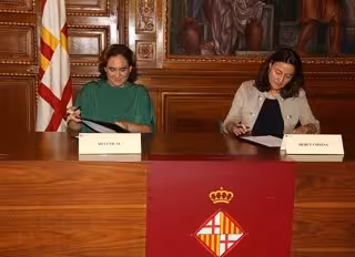 La presidenta de la Diputación de Barcelona, Mercè Conesa, y la alcaldesa de Barcelona, Ada Colau, han firmado este miércoles el convenio de colaboración bilateral que prevé una aportación de 30 millones hasta finales del mandato para las obras de los túneles viarios de la plaza de las Glòries y actuaciones en el Castillo de Montjuïc.