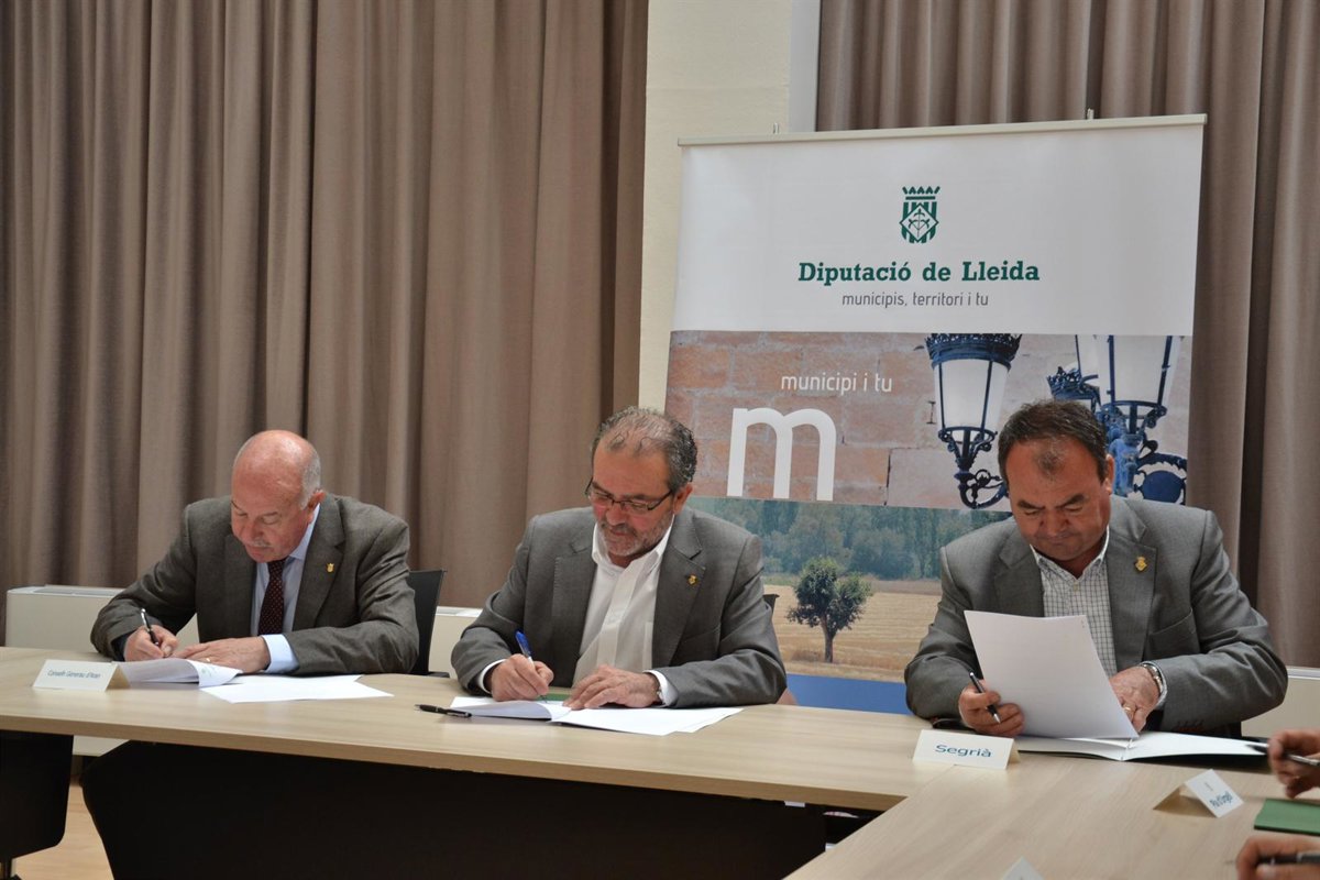 El presidente de la Diputación de Lleida, Joan Reñé, ha firmado este lunes con los presidentes de los consejos comarcales de Lleida y el síndic de la Vall d'Aran, Carles Barrera, los convenios anuales por los que la corporación aporta a sus instituciones 2,9 millones de euros para servicios de cooperación y asistencia, y contratar una treintena de secretarios interventores.