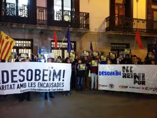Los manifestantes, que portaban 'estelades' y pancartas donde se leía 'Desobedecemos' y 'Ni rey ni miedo', han clamado también contra Felipe VI versionando una canción con la letra "si el Rey quiere corona, corona le daremos. Que venga a Sant Andreu y el cuello le cortaremos".