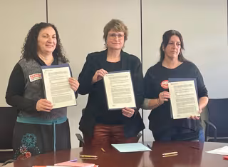 La secretaria general de CC.OO. Educació, Marga Romartínez; la consellera de Educación de la Generalitat, Anna Simó, y la responsable de Educación Pública de UGT, Lorena Martínez, firman recuperar sexenios y reducir jornada a los mayores de 55 años. - EUROPA PRESS