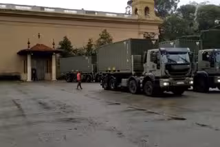 Llegada de camiones del Ejército para ampliar las plazas del espacio para personas vulnerables en el recinto Montjuc de Fira de Barcelona. - MINISTERIO DE DEFENSA