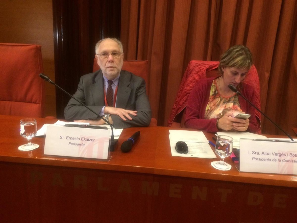 El periodista Ernesto Ekaizer ha acusado este martes en el Parlament al Gobierno central de desarrollar "una política criminal ante el auge del soberanismo" a través de la 'operación Catalunya'.