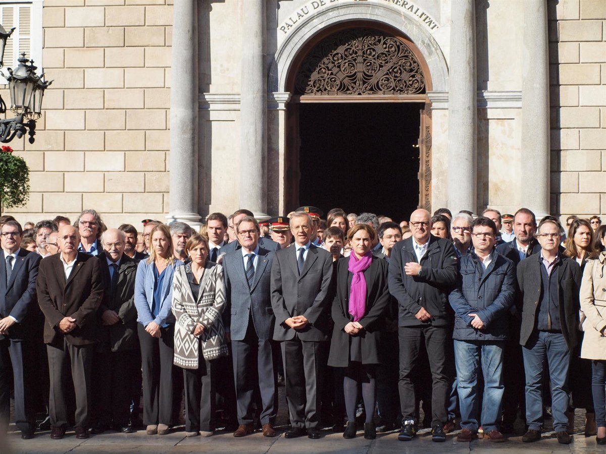 Representantes políticos, encabezados por el presidente de la Generalitat, Artur Mas, y la alcaldesa Ada Colau, y ciudadanos han hecho este sábado un emotivo minuto de silencio en plaza Sant Jaume en repulsa a los atentados de París y solidaridad con el pueblo francés, y que ha finalizado con un aplauso.