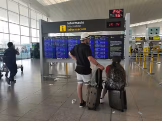 Pasajeros en el Aeropuerto de Barcelona ante un panel de información. - EUROPA PRESS