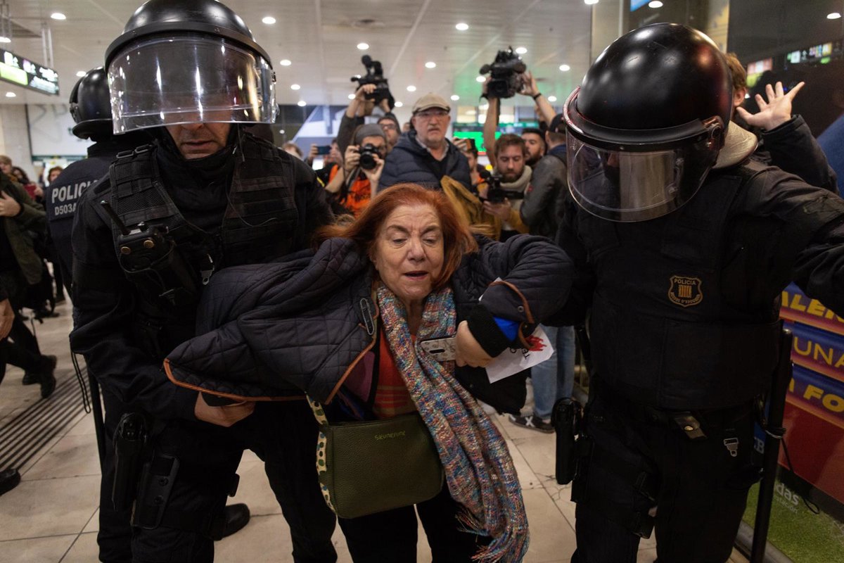 Agentes de los Mossos d'Esquadra sacan una a una, desde las 12.00 horas, a las personas que participan en la sentada ante el vestíbulo de acceso a los AVE la estación de tren Barcelona Sants, convocadas por los CDR.