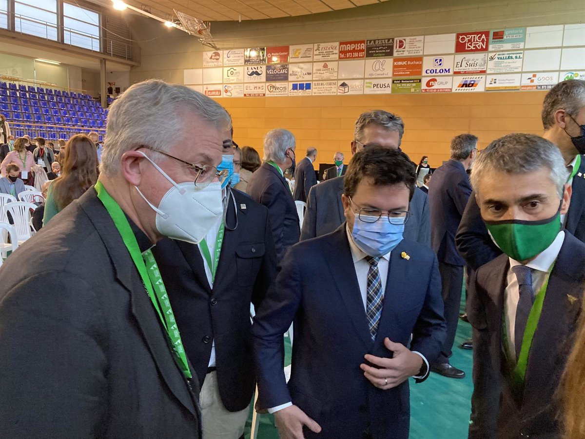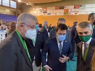 El presidente de la Generalitat, Pere Aragons, junto al director de la Trobada Empresarial al Pirineu, Vicen Voltes, y el obispo de La Seu d'Urgell, Joan Enric Vives, este viernes. - EUROPA PRESS