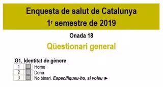 La Encuesta de Salud de Catalunya (Esca) del primer semestre de 2019 incorporará por primera vez la identidad de género del encuestado y, además del sexo biológico, preguntará si se identifica como hombre, mujer o 'no binario', incluyendo así a personas con identidades transgénero y no binarias, ha explicado en un comunicado este jueves la Conselleria de Salud de la Generalitat.