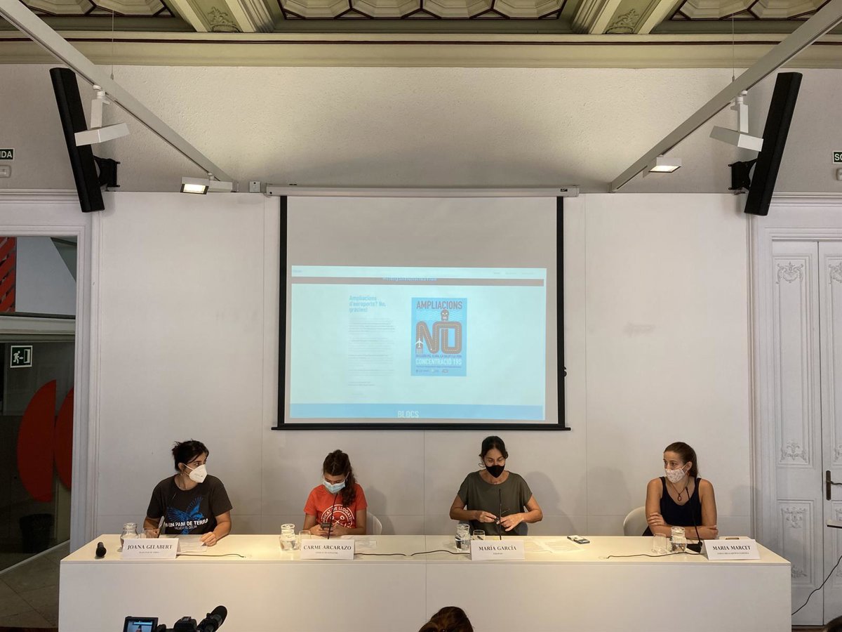Las representantes de las organizaciones que lideran la concentración contra la ampliación del Aeropuerto de Barcelona-El Prat durante la rueda de prensa. - EUROPA PRESS