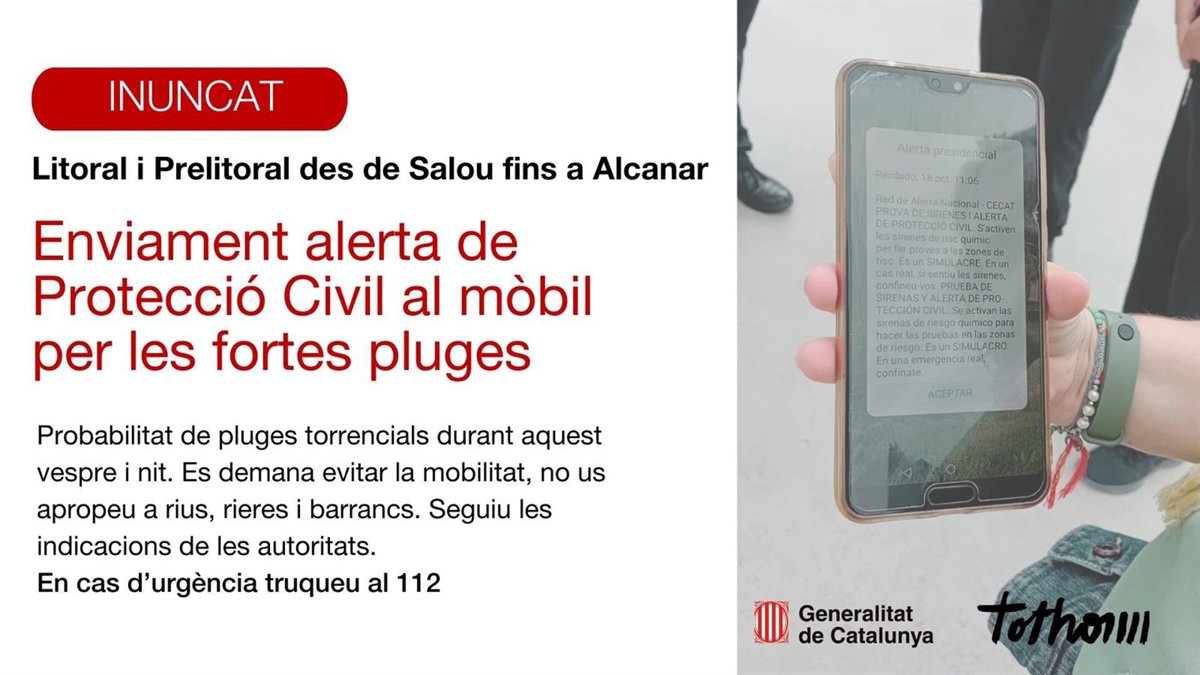 Protecció Civil de la Generalitat ha enviado este domingo por la tarde una alerta a los teléfonos móviles de todo el litoral y prelitoral desde Alcanar hasta Salou (Tarragona) por la previsión de lluvias torrenciales durante las próximas horas y durante la noche y ha pedido evitar la movilidad.