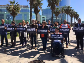 La treintena de manifestantes han mostrado pancartas en inglés con los lemas 'España nos espía' y 'Democracia bajo vigilancia'.