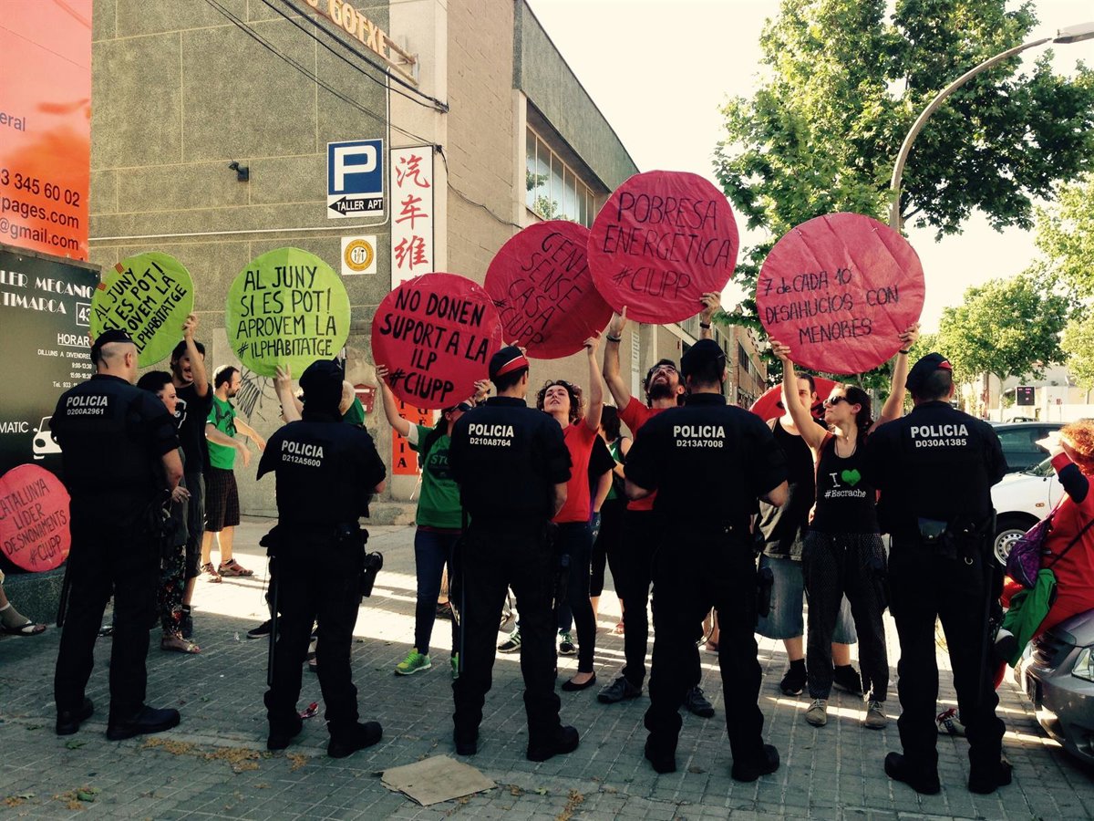 Los Mossos han tenido a los concentrados a varios metros de distancia de la puerta por la que ha entrado Rajoy, y los activistas han mostrado carteles con mensajes como '7 de cada 10 desahucios son con menores', 'En junio se puede, aprobemos la ILP para la vivienda', y 'Acabemos ya con la pobreza energética'.