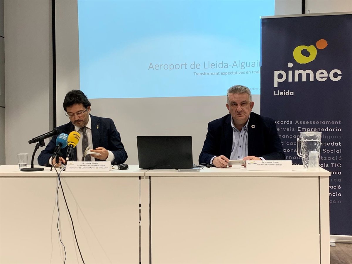 El secretario de Infraestructuras y Movilidad de la Generalitat, Isidre Gavín, ha anunciado la inversión de BAA en una conferencia en la sede de Pimec Lleida a la que han asistido el presidente de la patronal, Jaume Saltó, y empresarios de la provincia.