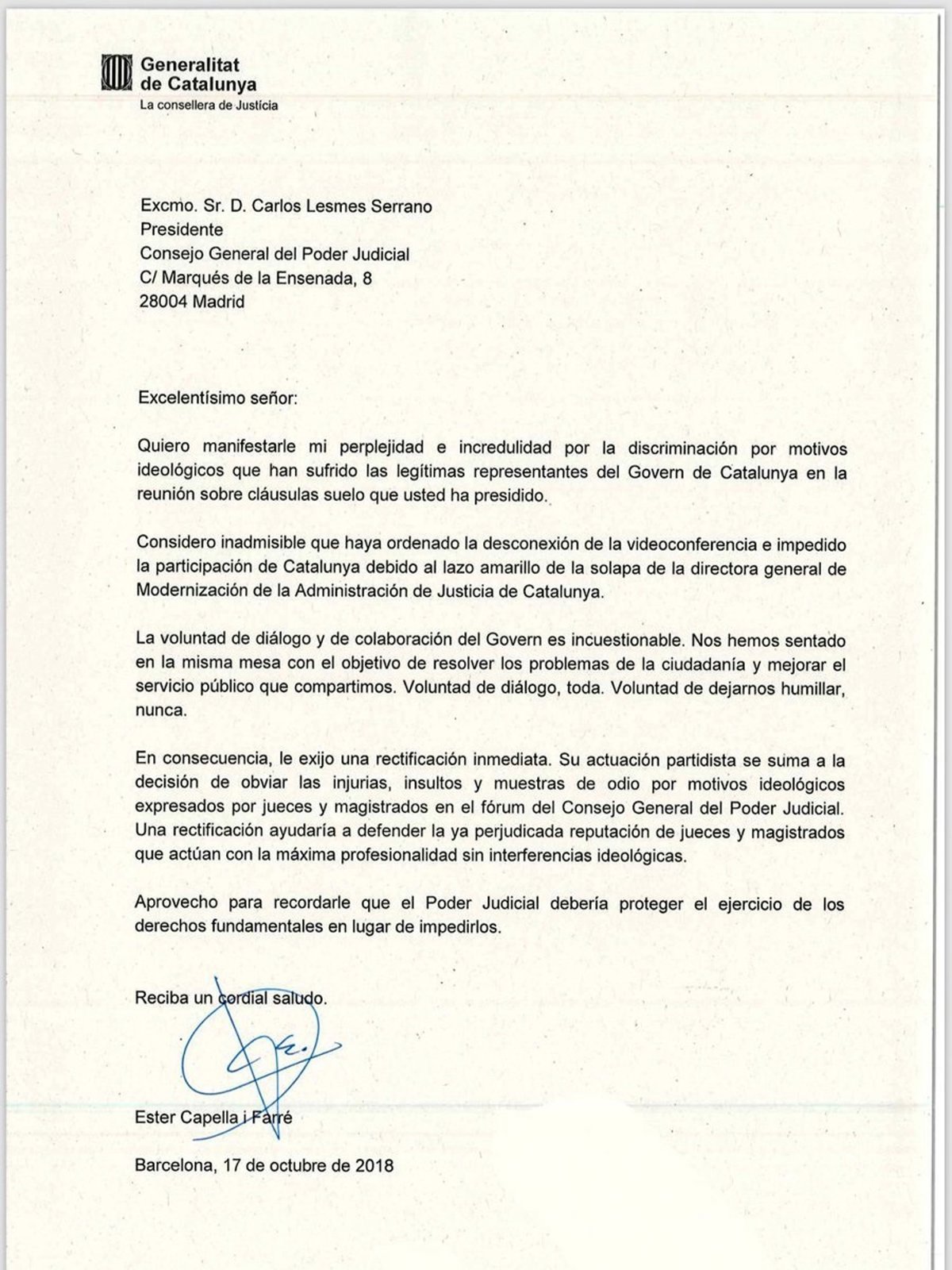 La consellera de Justicia de la Generalitat, Ester Capella, ha criticado este miércoles por carta al presidente del Consejo General del Poder Judicial (CGPJ), Carlos Lesmes, la "discriminación por motivos ideológicos" a un cargo del Govern por llevar un lazo amarillo en una reunión sobre cláusulas suelo en que ha participado por videoconferencia.
