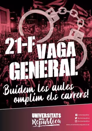Universitats per la República ha convocado para este jueves una manifestación estudiantil que partirá de la plaza Universitat de Barcelona bajo el lema 'Buidem les aules, omplim els carrers!', en una de las convocatorias previstas en el marco de la huelga general impulsada por la Intersindical-CSC.