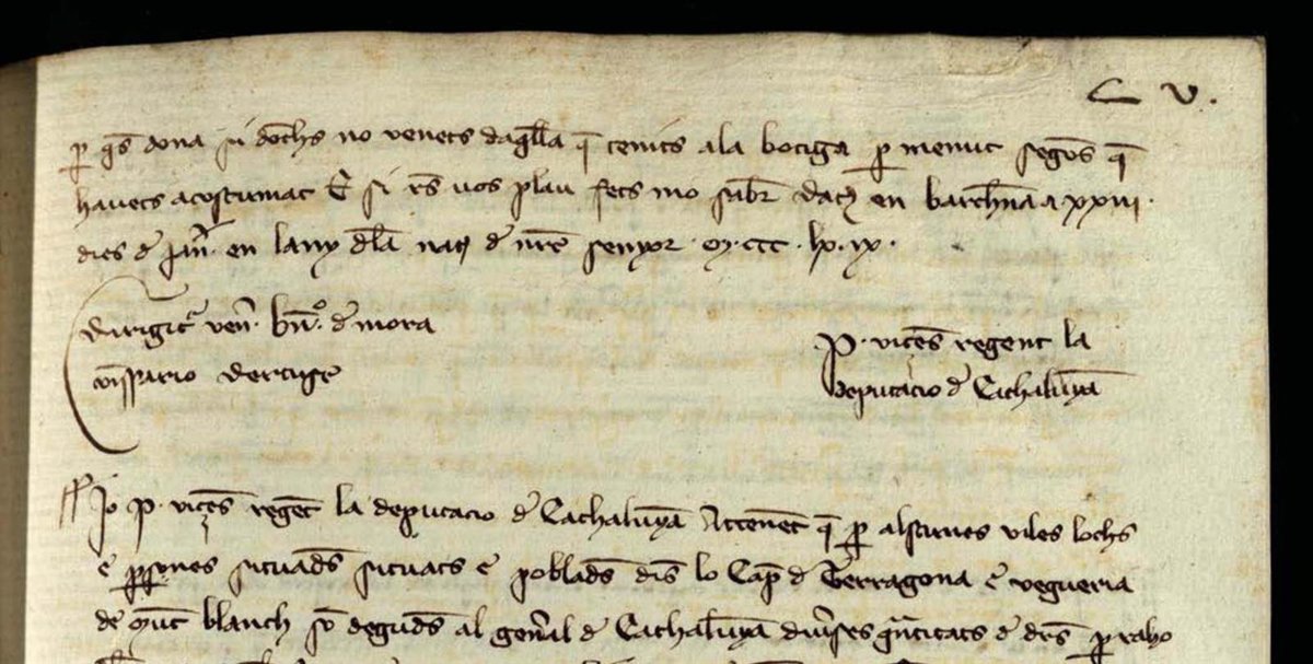 Firma de Pere Vicen (arriba, a la derecha), como "Pere Vicen regente la Deputació de Cathalunya", según se lee en un documento del Archivo de la Corona de Aragón. - ARXIU DE LA CORONA D'ARAGÓ