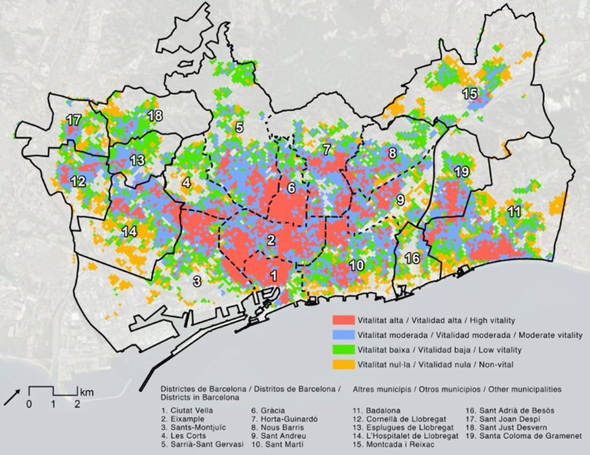 Los investigadores del departamento de Geografía y del Institut de Ciència i Tecnologia Ambientals de la Universitat Autònoma de Barcelona (ICTA-UAB), Xavier Delclòs y Carme Miralles, han mapeado la vitalidad urbana de Barcelona, apuntando que zonas alejadas del centro y barrios humildes tienen un alta vida en la calle