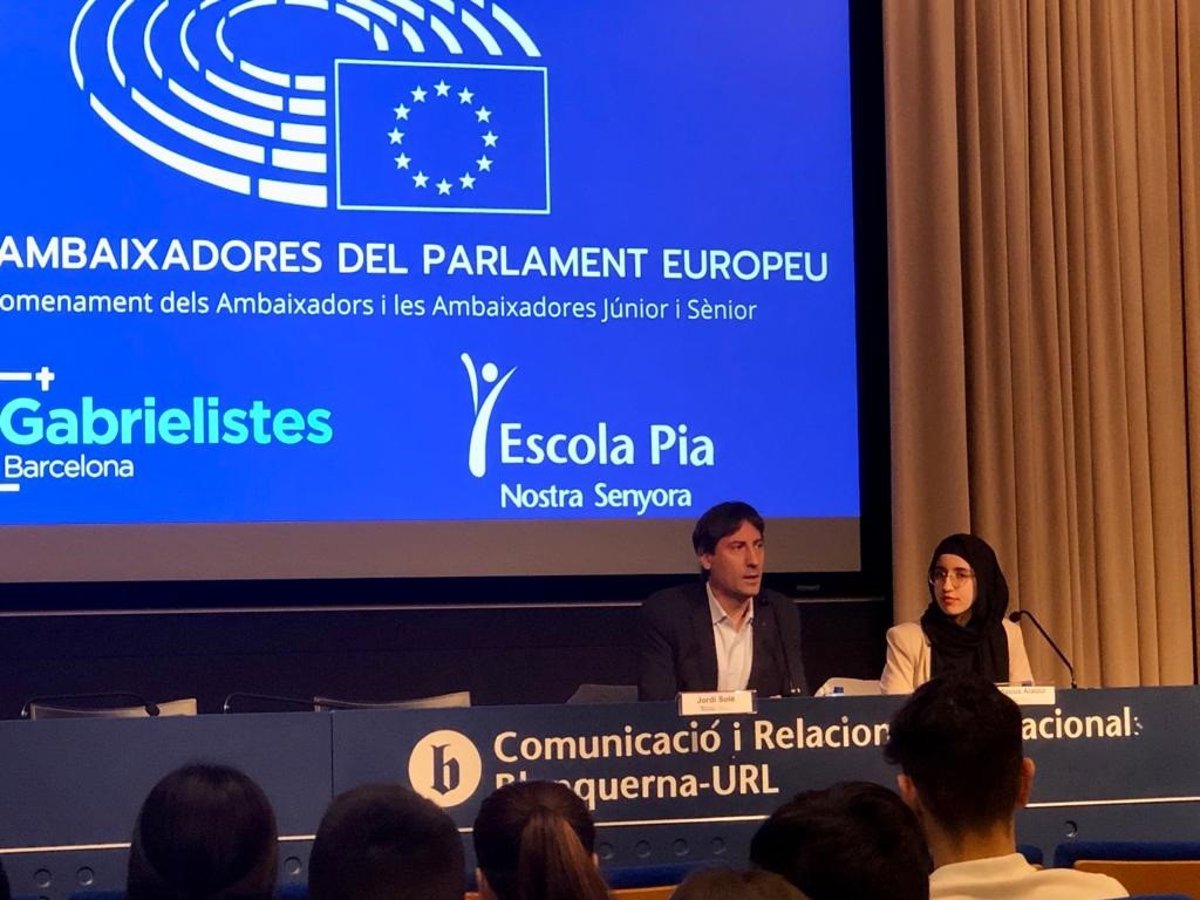 Un centenar de alumnos de ESO y Bachillerato de la Escola Pia Nostra Senyora y del Collegi Sant Gabriel de Barcelona han recibido este viernes la acreditación del Parlamento Europeo en un acto en la Facultad de Comunicación y Relaciones Internacionales de la Universitat Ramon Llull (URL) en Barcelona, que ha sido presidido por Solé y la activista Firdaous Alaoui.