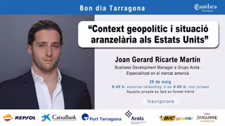 La Cámara de Tarragona acogerá en sus jornadas 'Bon dia' al Business Development Manager en Grupo Arola y especialista en el mercado americano, Joan Gerard Ricarte, el próximo 29 de mayo para hablar de la situación arancelaria de Estados Unidos.