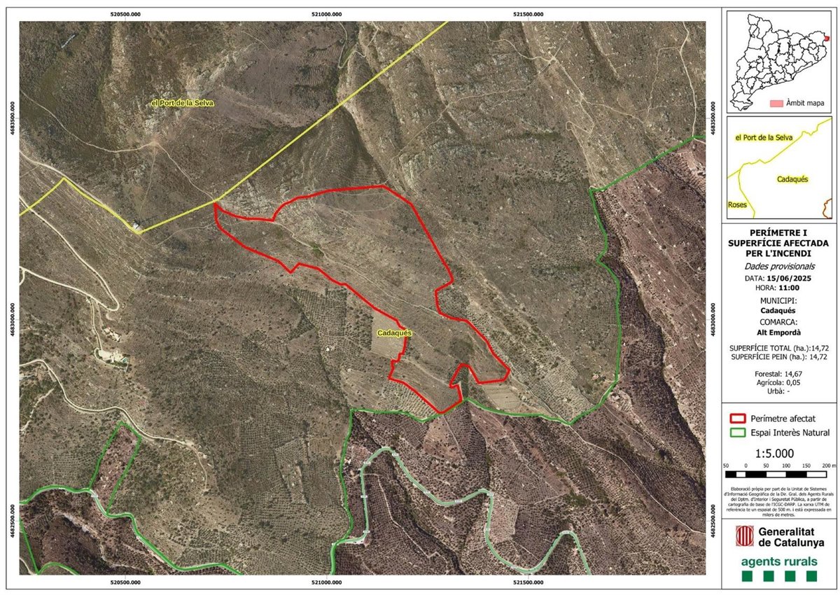 Los Bombers de la Generalitat han dado por extinguido este domingo a las 19.19 el incendio forestal en Cadaqués (Girona), que empezó este sábado a mediodía en una zona rodeada de viñedos y que ha afectado 14,72 hectáreas del Parque Natural del Cap de Creus, según datos de Agents Rurals.