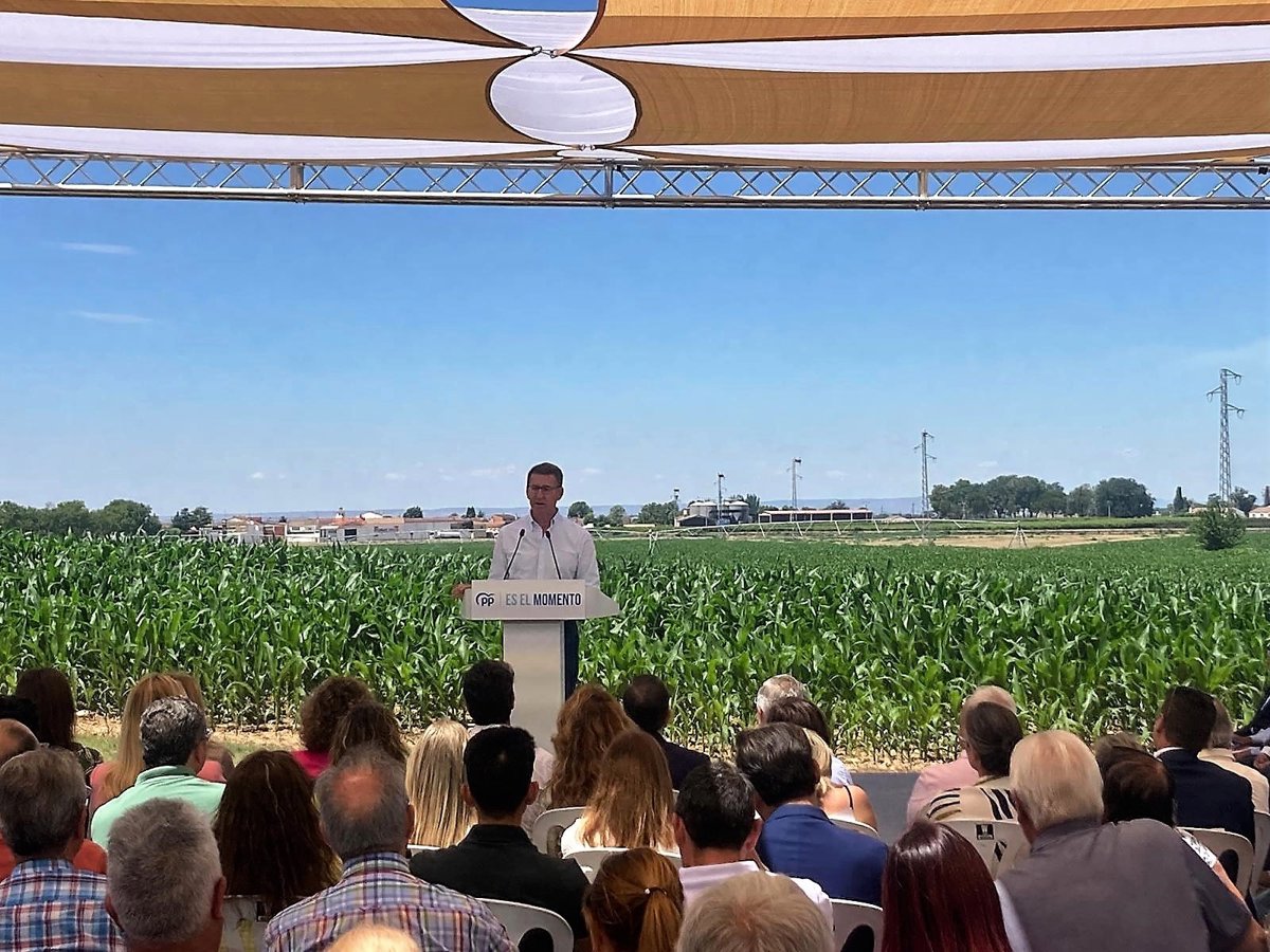 El líder del PP y candidato a presidir el Gobierno, Alberto Núñez Feijóo, ha prometido este sábado una ley de apoyo al sistema alimentario español e invertir en 6 años 40.000 millones de euros en infraestructruras hídricas.