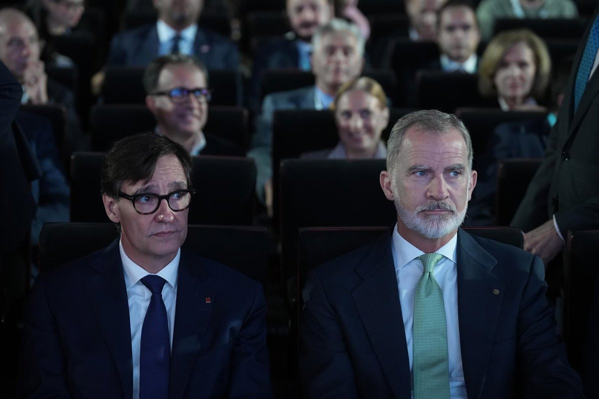 El Rey Felipe VI (d) y el presidente de la Generalitat, Salvador Illa (i), durante la segunda jornada del foro 'World in Progress', en el Palau de Congressos de Catalunya, a 21 de octubre de 2025, en Barcelona - David Zorrakino - Europa Press